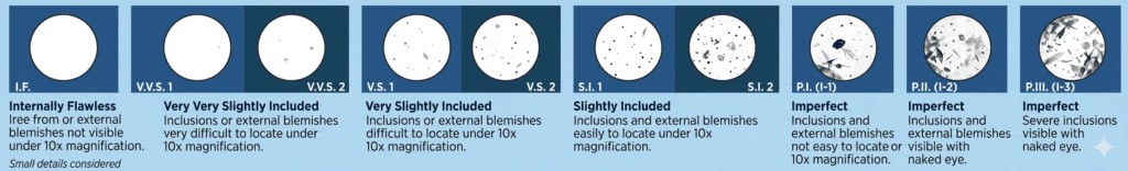 Clarity is the degree to which a stone is free from external marks called blemishes and internal features called inclusions. Together they represent the clarity characteristics or clarity features of the stone. You may be more familiar with terms such as “flaws,” “imperfections” or “defects. The more of these characteristics that are observed using a 10X magnification, the less the value of the diamond.